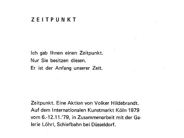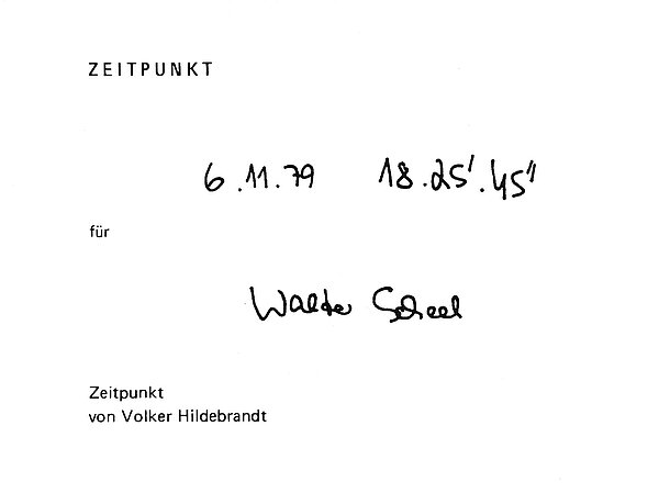 A few months after I sent the postcards with "1 piece of correct time from Greenwich", the International Art Market took place in Cologne (November 6th - 12th, 1979). In collaboration with the Löhrl Gallery, I carried out the ZEITPUNKT (POINT IN TIME) campaign. When I met people at the art market, I noted the exact time for the person and the corresponding name on a card to document the project. In total there were 395 ZEITPUNKTE (POINTS IN TIME). All of them were published in my "zeit-schrift 1/80", which appeared in March 1980. The same applies here below, in the same way as back then. Lower case and the time in the sequence of day, month, year, hour (0 - 24), Minute, second.