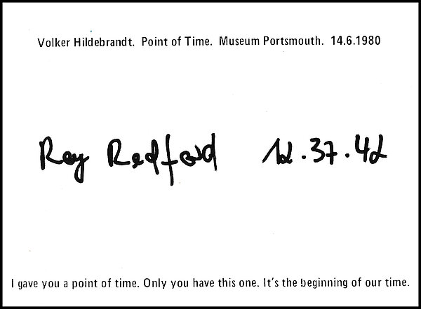 On June 14, 1980, the exhibition „Artists from Duisburg“ was opened in the Portsmouth City Museum. I took part in it. During the vernissage I awarded 26 POINTS OF TIME. The time is recorded in the format hour (0 – 24), minute (without prime), second (without double prime). Day, month and year are specified once for all.