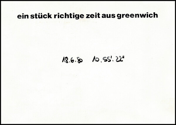 After the days in Portsmouth, I went to Greenwich again. And again I sent postcards from there with a piece of the correct time from Greenwich, a POINT IN TIME, written in the format day, month, year, hour (0 - 24), minute, second.